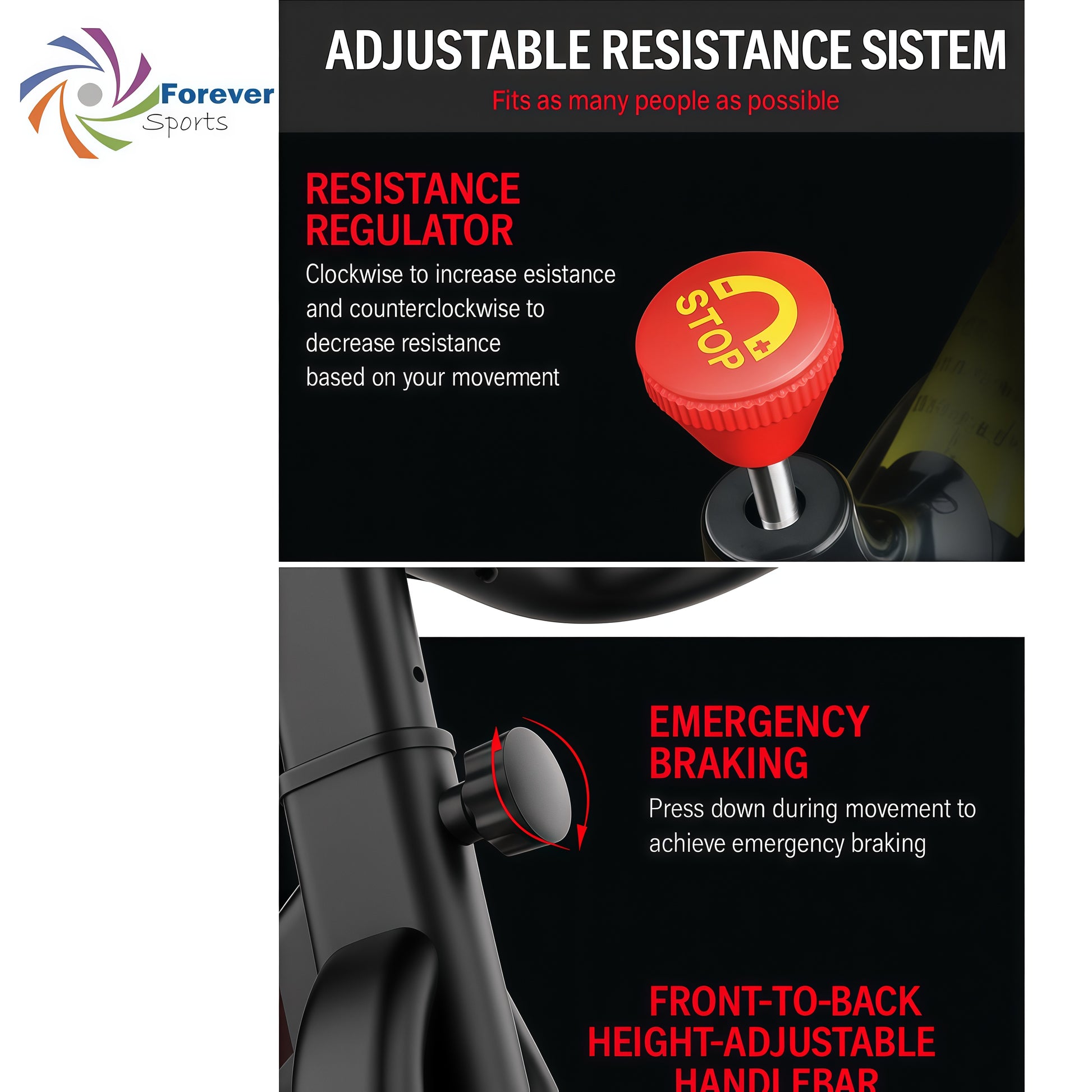 Unleash your fitness potential with the Forever Sports Spin Bike, designed for both performance and comfort. Featuring a heavy-duty flywheel, it delivers a smooth, stable, and realistic riding experience. The adjustable resistance system allows you to tailor each session to your fitness level — from light warm-ups to high-intensity workouts.